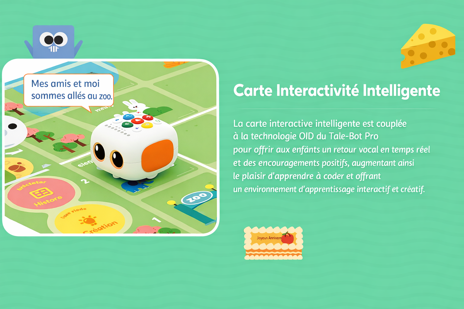Le robot de codage MatataStudio Tale-Bot Pro peut reconnaître certaines cartes interactives et autocollants interactifs via le capteur de détection optique OID situé en bas, fournissant un guidage vocal attrayant et un retour instantané. Encouragez les enfants à explorer le monde amusant des jeux de codage avec le robot éducatif MatataStudio dans Coding Games.