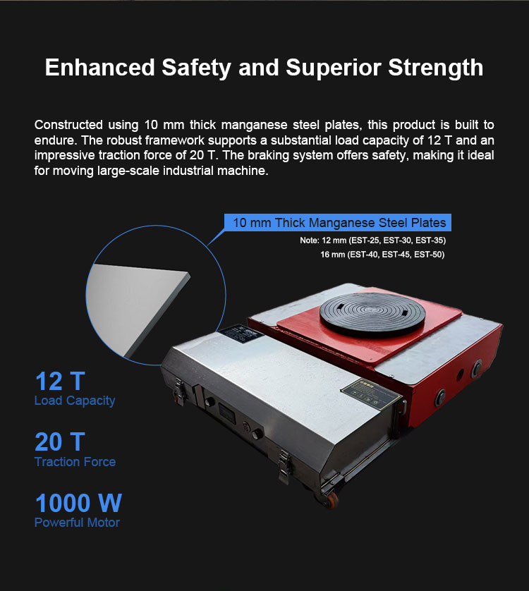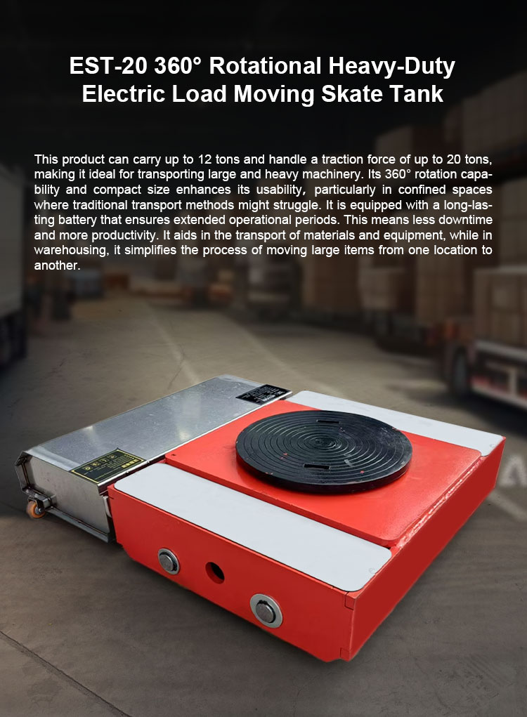 Le chariot élévateur électrique rotatif à 360° EST-25 est conçu pour les applications intensives. Ce chariot élévateur électrique est la solution idéale pour déplacer des machines et équipements de gros tonnage. Doté d'un puissant moteur double de 750 W, il offre une capacité de traction de 20 tonnes et une capacité de charge allant jusqu'à 12 tonnes.