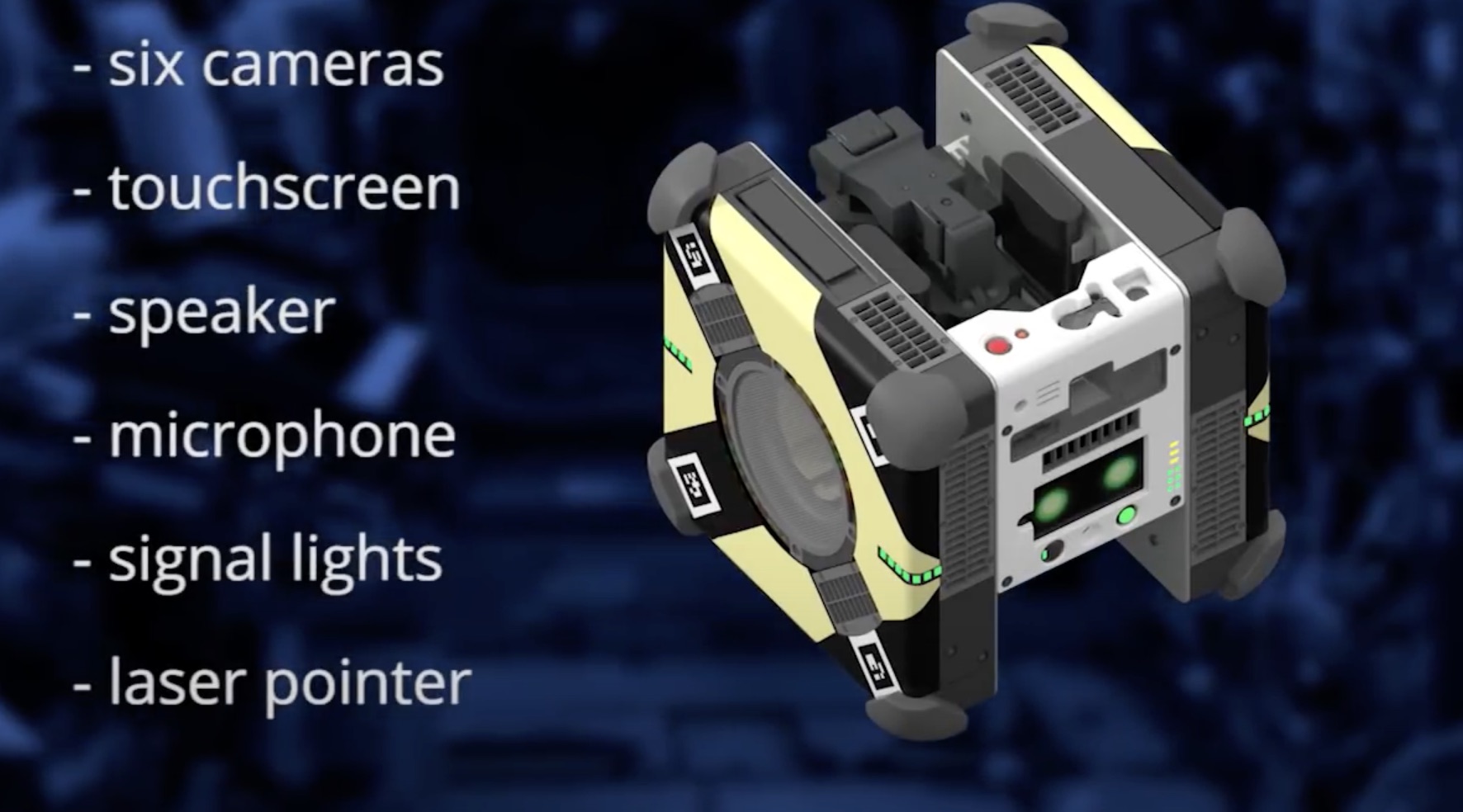 Le système Astrobee se compose de trois robots en forme de cube, d'un logiciel et d'une station d'accueil utilisée pour la recharge. Les robots utilisent des ventilateurs électriques comme système de propulsion qui leur permet de voler librement à travers l'environnement de microgravité de la station. Les caméras et les capteurs les aident à « voir » et à naviguer dans leur environnement. Les robots portent également un bras perché qui leur permet de saisir les mains courantes de la station afin d'économiser de l'énergie ou de saisir et de tenir des objets.