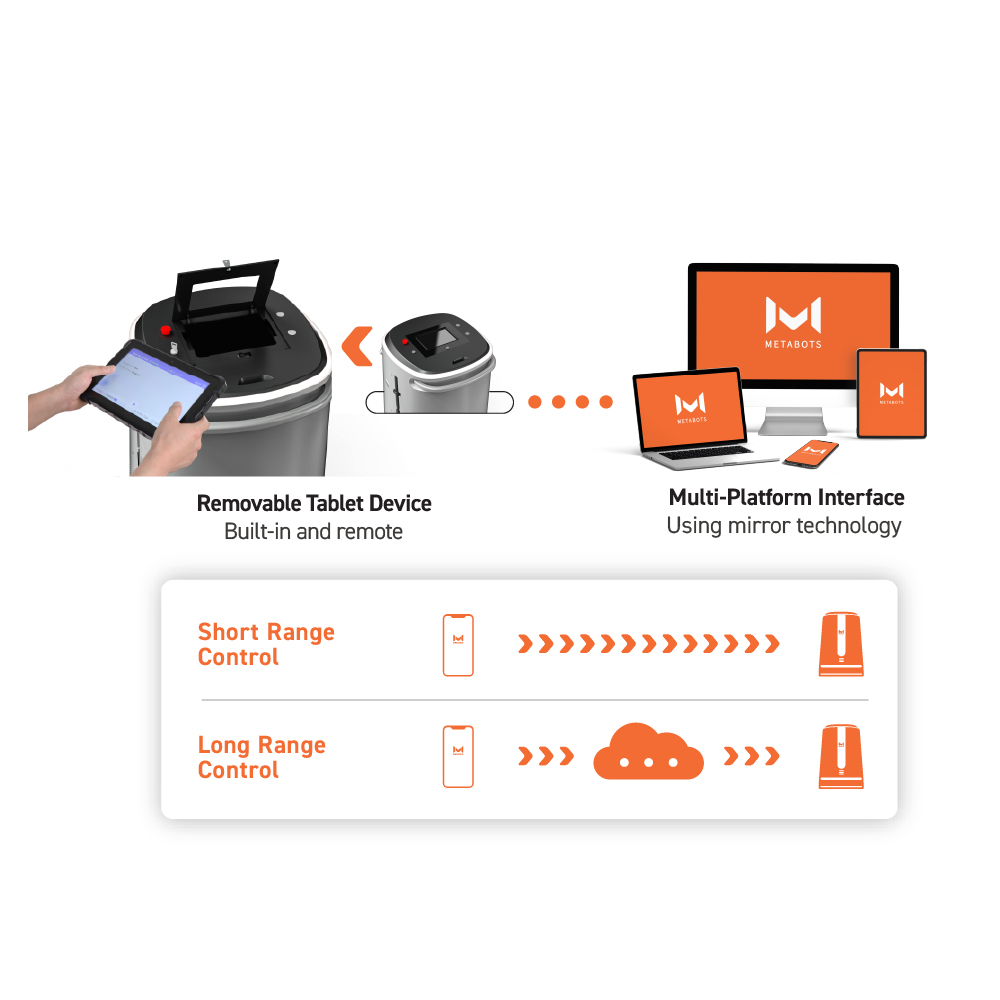 Grâce à la technologie Mirror, l'application METABOTS peut être utilisée simultanément à partir de n'importe quel type d'appareil. Les utilisateurs peuvent utiliser leurs propres appareils pour contrôler et interagir avec META-SCRUB 60.